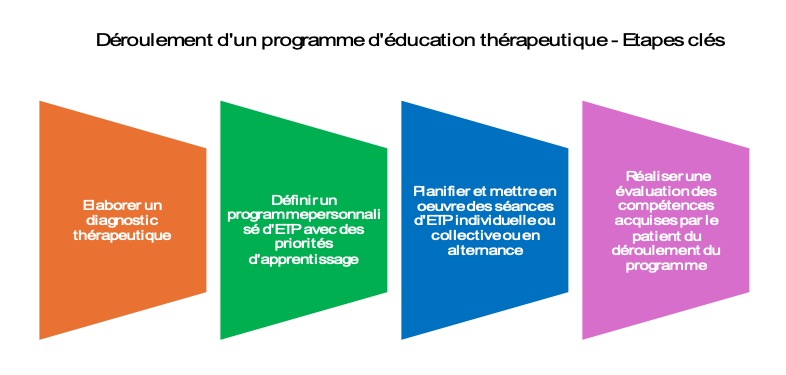 Très concrètement, l’éducation thérapeutique soulève la question des méthodes et du rôle du soignant. Elle repose sur une étape essentielle qui est le développement des compétences du patient. La question éducative est à l’évidence au cœur de la démarche. Elle ne se réduit pas à de l’information portant sur des savoirs ou des savoirs faire. Elle vise à l’appropriation des savoirs et leur transformation par la personne qui en est destinataire. Très concrètement, la démarche se déroule en quatre étapes résumées dans le schéma ci-après :